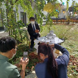 職員が手作りで撮影したお月見団子や実は凝っているお月様などがしっかり写真に写るように撮影指示を出す施設長を撮影する職員を撮影しました。